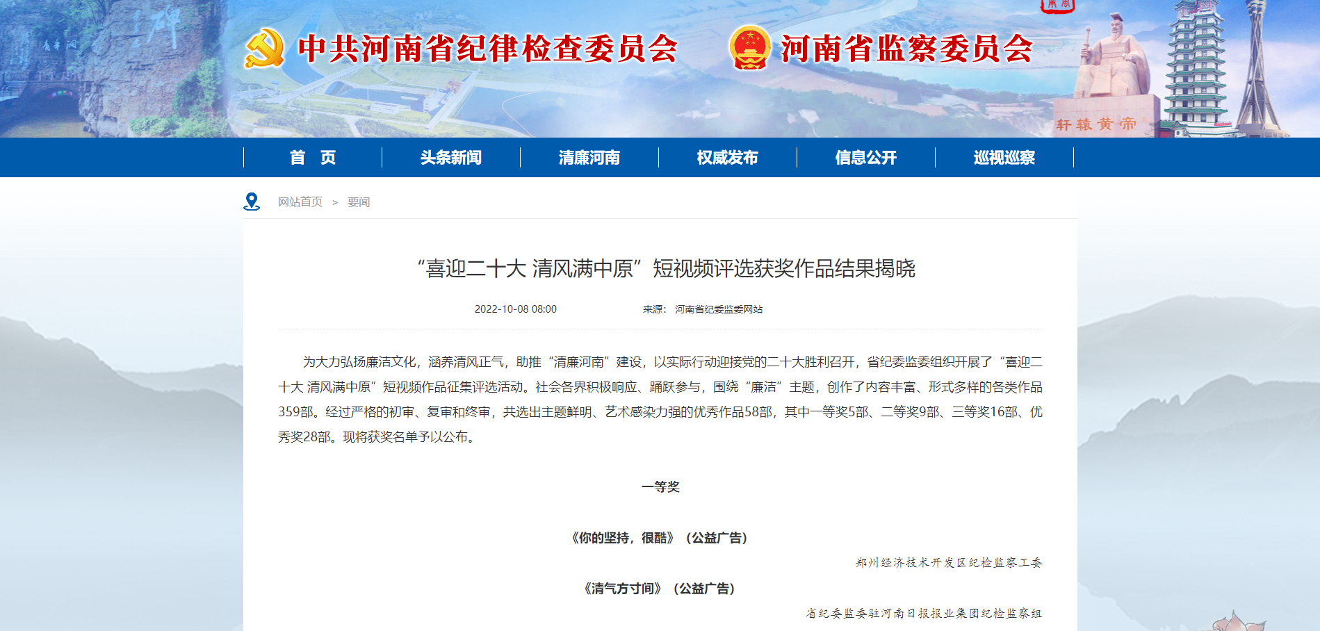 來源: 本站 發(fā)布時(shí)間: 2022-10-0810月8日,公司制作的短視頻《位子》,在河南省紀(jì)委監(jiān)委組織開展的“喜迎二十大 清風(fēng)滿中原”短視頻評(píng)選活動(dòng)中榮獲三等獎(jiǎng)!