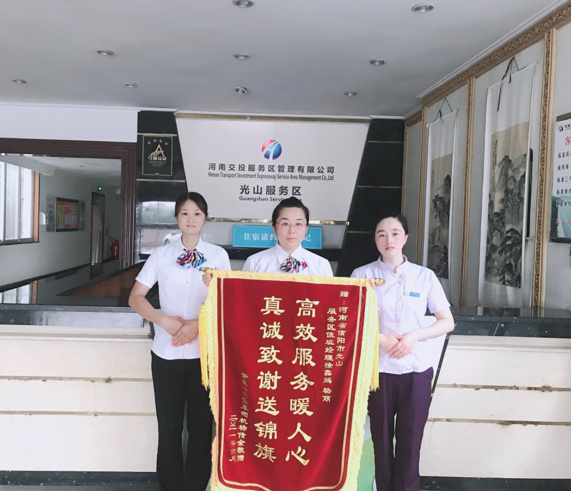 7月4日,光山服務區收到由安徽六安貨車郵寄來的的一面錦旗,上面寫著“高效服務暖人心 真誠致謝送錦旗”。